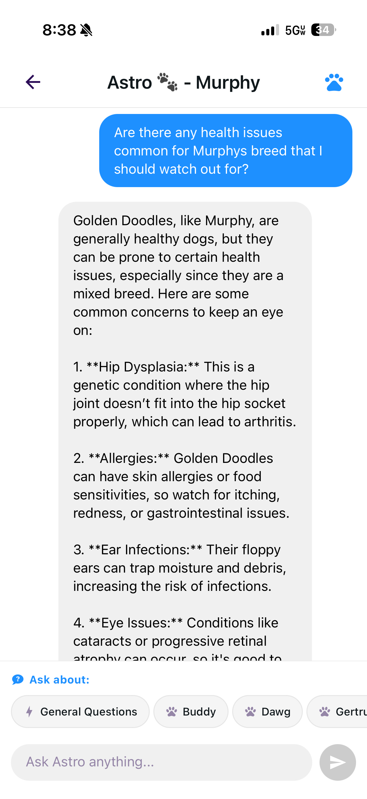 Astro is Pawgress's built-in AI that understands your pet's full profile, including health records, weight trends, breed details, and timeline updates, so you can ask questions and get clear, contextual answers using your pet's real data.